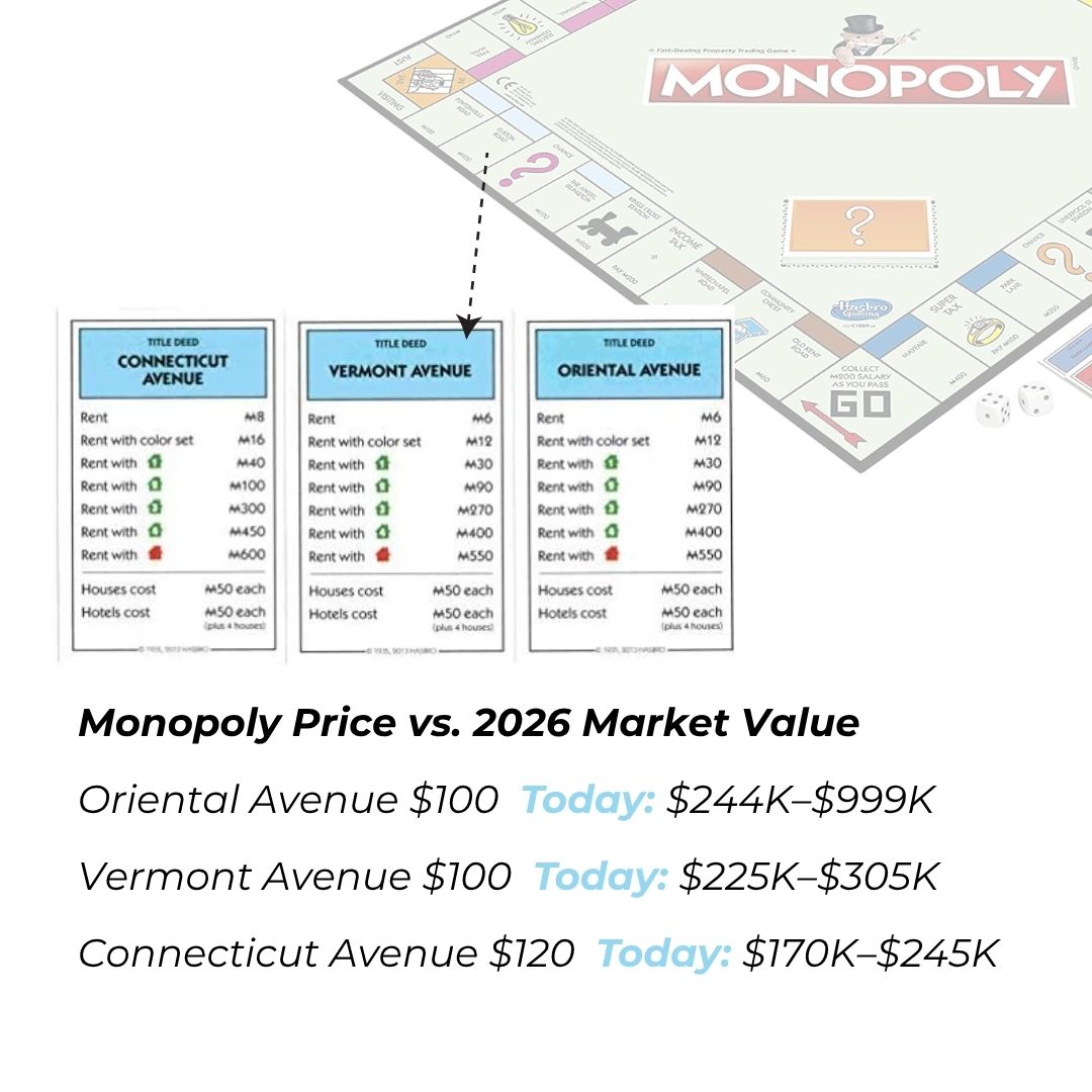 The classic U.S. Monopoly board was modeled on the actual streets of Atlantic City, New Jersey, right down to the color groupings and price hierarchy. So we did what any self-respecting real estate obsessive would do – we looked up what those same addresses could actually cost you today.