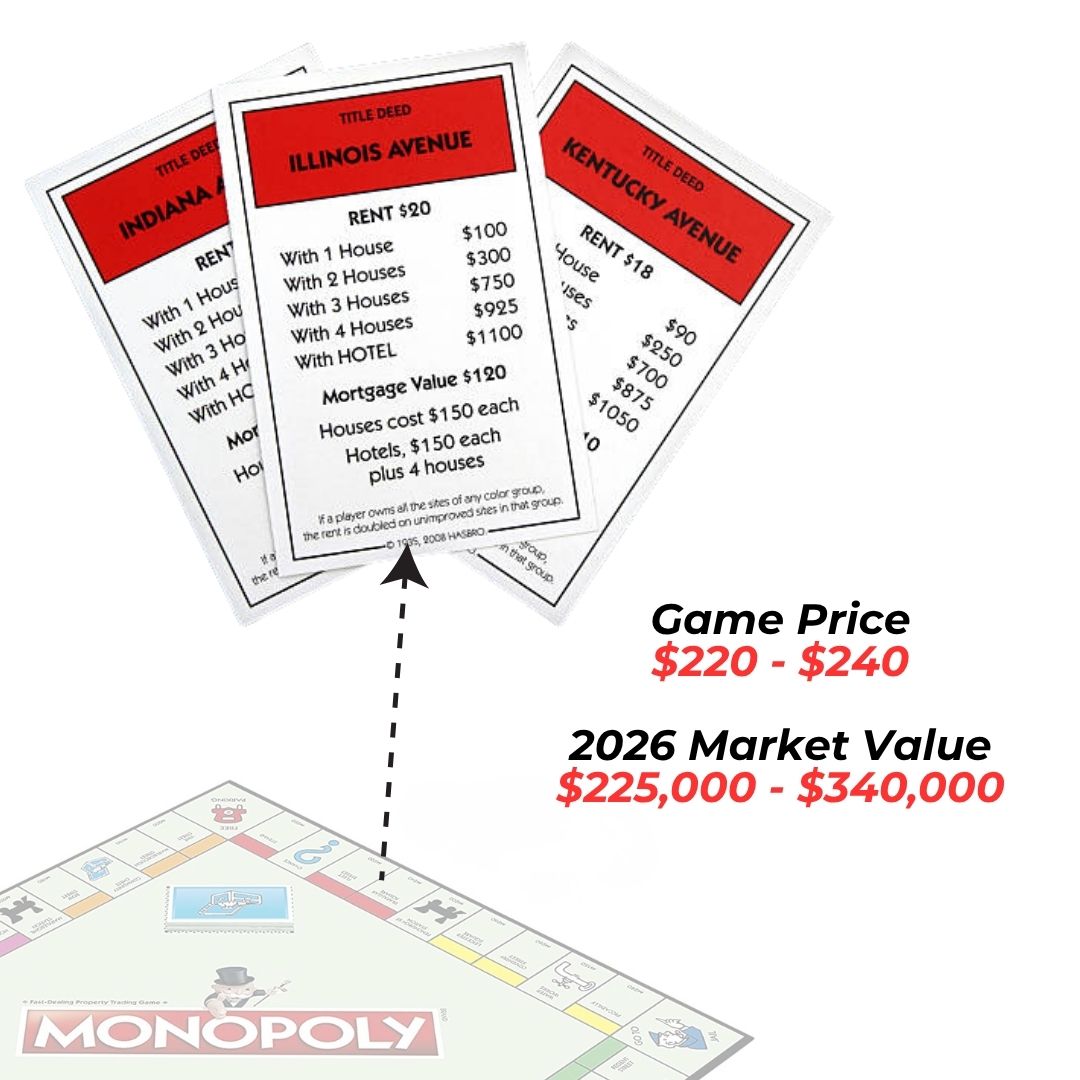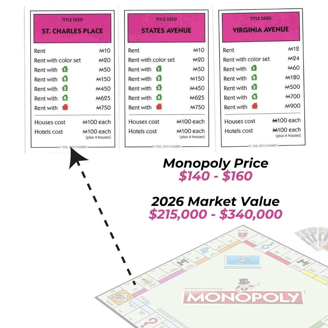 connecting to properties along the shoreline. These mid-range pink properties were never glamorous in the game — they’re the ones you buy early and quietly develop while everyone else fights over the oranges.