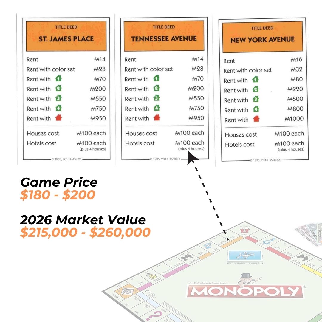 Avenue — located in the middle of the board – the most. They’re affordable enough to develop early, and hotels there become a slow, grinding money machine. In Atlantic City today, those three streets are still a real neighborhood called the “Orange Loop”. Three blocks of Tennessee, New York, and St. James Place now host some of the city’s best local restaurants and businesses, a genuine destination in a city that doesn’t always get enough credit for its residential character.